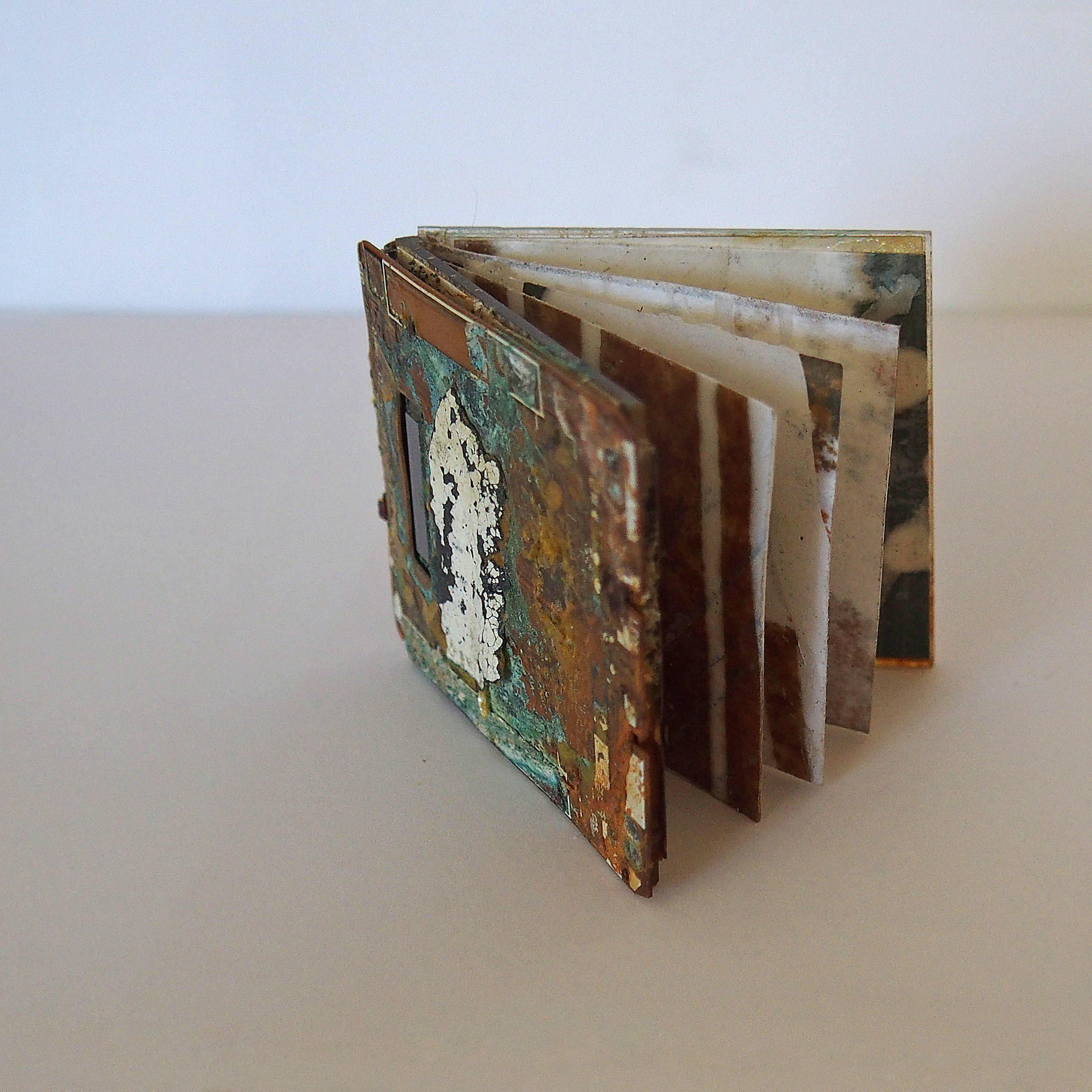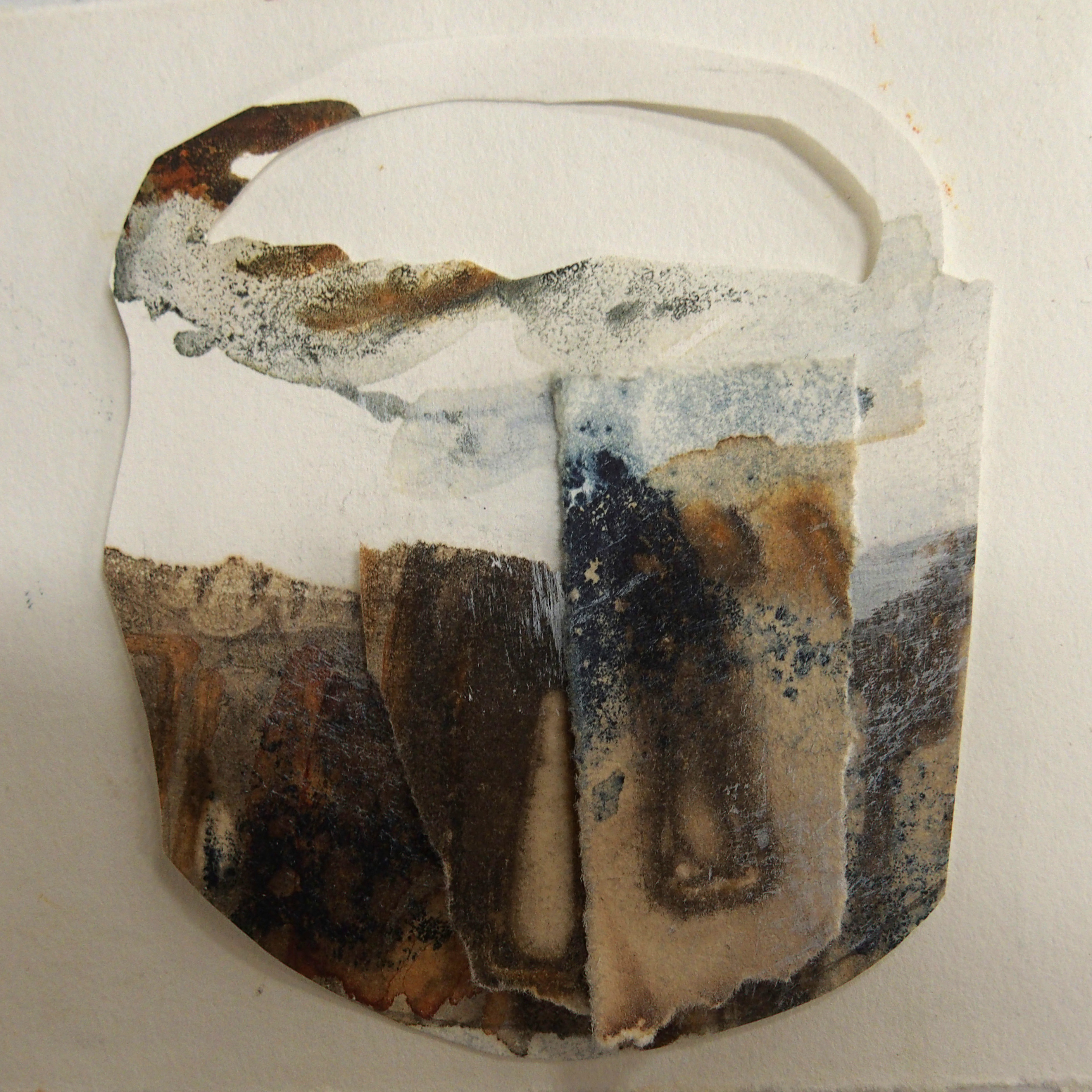I spend many hours scouring beaches and harbours – I seem to have an inbuilt “eye” for spotting these abandoned bits and bobs and, unlike most folk, I see their potential for use in art. I carry at least two bags with me – one for collection of the plastics and other trash washed ashore – and the other for my “treasure”. My work is all about texture, form and marks. I like to work with a variety of media, in 2D and 3D, using materials that I find: either directly or as inspiration.
