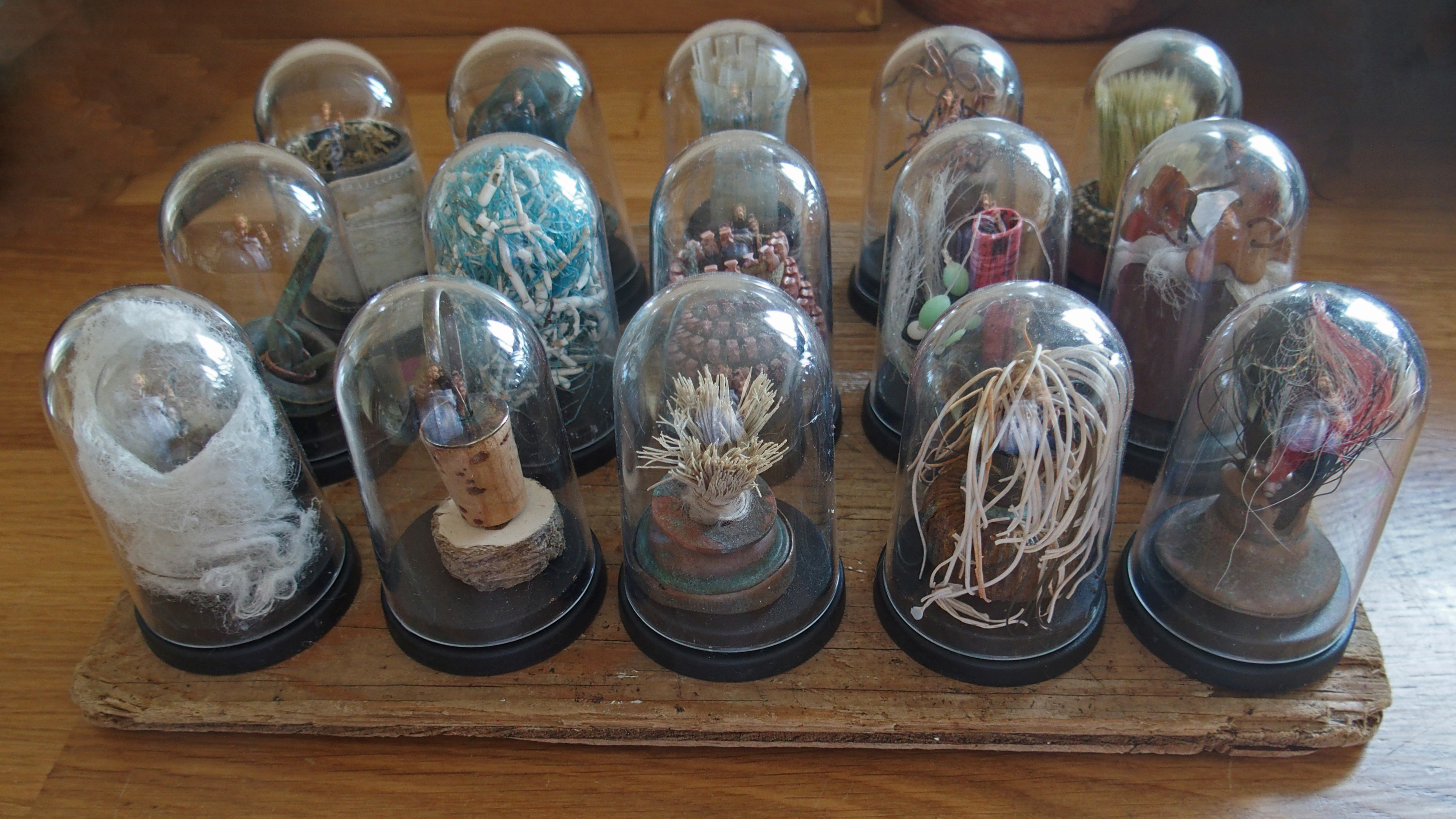 My work is produced in response to the litter and marine debris that I find on my walks around the United Kingdom. I do not collect pretty driftwood or beautiful stones but rather the junked and the jettisoned – the stuff that most people just pass by. It is these objects, once made and utilised by man and then discarded by him, that interest me. An old brush, a cuff from an old anorak, a boat engine fuel filter, a lobster pot spacer – these are my pieces of treasure – litter that I can repurpose to draw attention to the problem of marine debris.